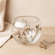 Clear, rounded walls cradle delicate dried baby’s breath; when a tealight is lit, the bowl scatters a soft, calming glow across the room. The fishbowl silhouette feels smooth in the hand, with gentle milky marbling and tiny bubbles that reveal its handcrafted nature. 🌼🕯️