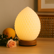 A soft, matte glow settles through a teardrop form. The white, geometric-textured shade feels calm to the touch, while a small natural-wood base steadies the piece with quiet warmth.