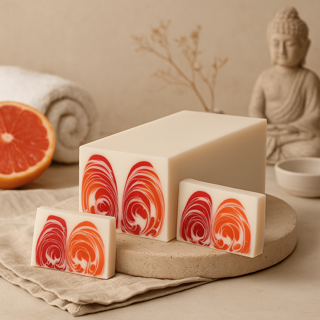 In use, it releases a creamy, cushioned lather that rinses clean, leaving skin feeling fresh and comfortable. The fragrance opens bright and zesty, with sparkling grapefruit peel and a gentle, juicy sweetness that lingers softly in the room. There’s simple satisfaction in slicing the loaf into bars; each cut reveals the same embedded marbling, so every piece carries the handmade charm and clean lines of the whole. ✂️