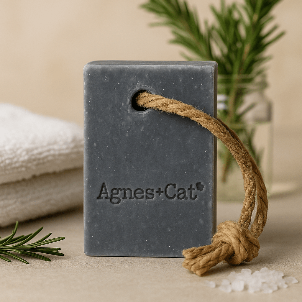 🧼 A dark, matte bar with a natural-fiber cord — a clever nod to tradition that keeps your soap hanging neatly, drying swiftly, and always within reach.