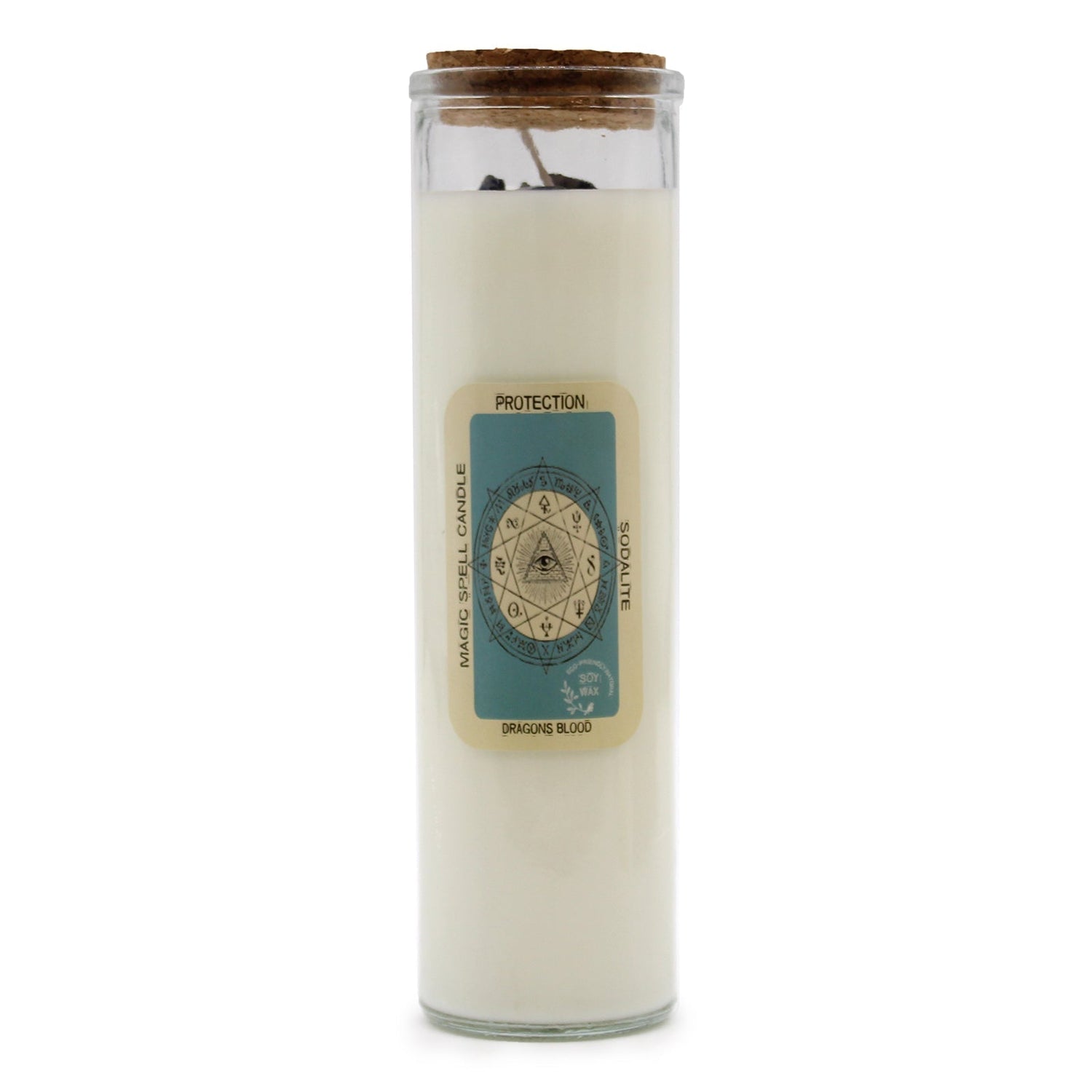 🕯️ Erhöhen Sie Ihre spirituelle Praxis mit unserer Zauberkerze – Schutz. Diese aus Sojawachs gefertigte Kerze enthält echte Sodalith-Edelsteine, die für ihre friedensstiftenden und schützenden Eigenschaften bekannt sind. Der bezaubernde Duft von Drachenblut erfüllt die Luft und bildet einen Schutzschild gegen negative Energien. 🧘♀️