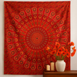 Leuchtend rote Tagesdecke und Wandbehang aus Baumwolle mit Mandala-Motiv „Pfau“ – vielseitig verwendbarer Wandteppich mit aufwendigem Blumen- und Paisley-Design