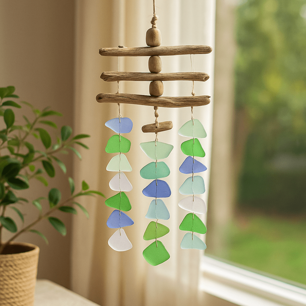 A soft breath lifts the sea-glass-like pieces and a bright, delicate chime unfolds — a quiet reminder of balance, presence, and the unseen flow that moves through a space. Harmony hangs lightly here, carried on sound. 🌬️