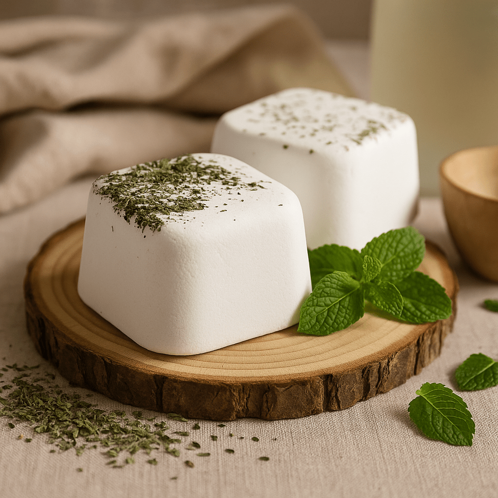 As it slowly fizzes at the edge of the water, the matte cube releases a bright, uplifting scent that wakes the senses and clears the mind—fresh notes rising with each breath. A few subtle green botanical flecks on one side hint at the natural blend within, shaping the atmosphere and gently elevating mood from the first inhale. 🌿