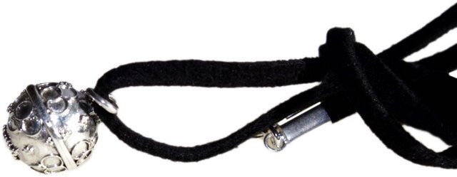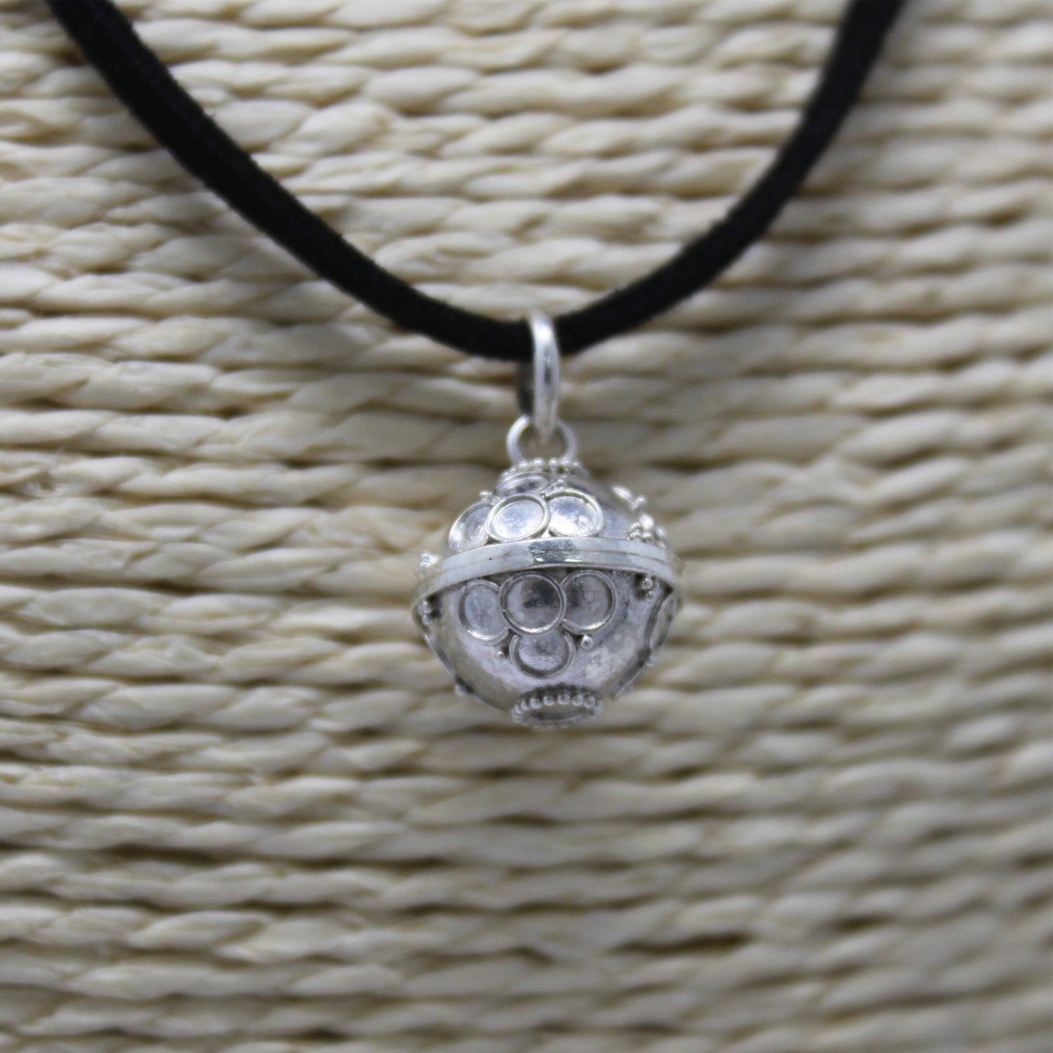Entdecken Sie die Eleganz der Silver Angel Bell – Grace, einer Halskette, die mit Liebe auf dem heiligen Berg Ubud auf Bali gefertigt wurde. Dieses exquisite Stück besteht aus einem 12 mm großen kugelförmigen Anhänger aus 92,5er Silber, der an einer einfachen schwarzen Kordel mit silbernen Details und Verschlüssen befestigt ist. Die glänzende, reflektierende Oberfläche des Anhängers verleiht ihm einen Hauch von Raffinesse und macht ihn perfekt für legere und halbformelle Anlässe.