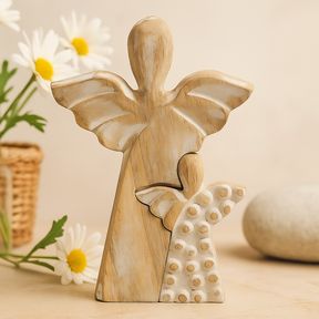 Το απαλώς ασπρισμένο ξύλο μάνγκο αιχμαλωτίζει το φως, αποκαλύπτοντας ήρεμο νερά και απαλή χειροτεχνία. Ένας μεγαλύτερος άγγελος προστατεύει έναν μικρότερο στο πλάι του· φτερά με λεπτές χαραγές, το μικρότερο ράσο διακοσμημένο με απτικό μοτίβο. Στέκεται ελεύθερα με επίπεδη βάση, ξεκουράζεται εύκολα σε ράφι ή τζάκι. 🕊️