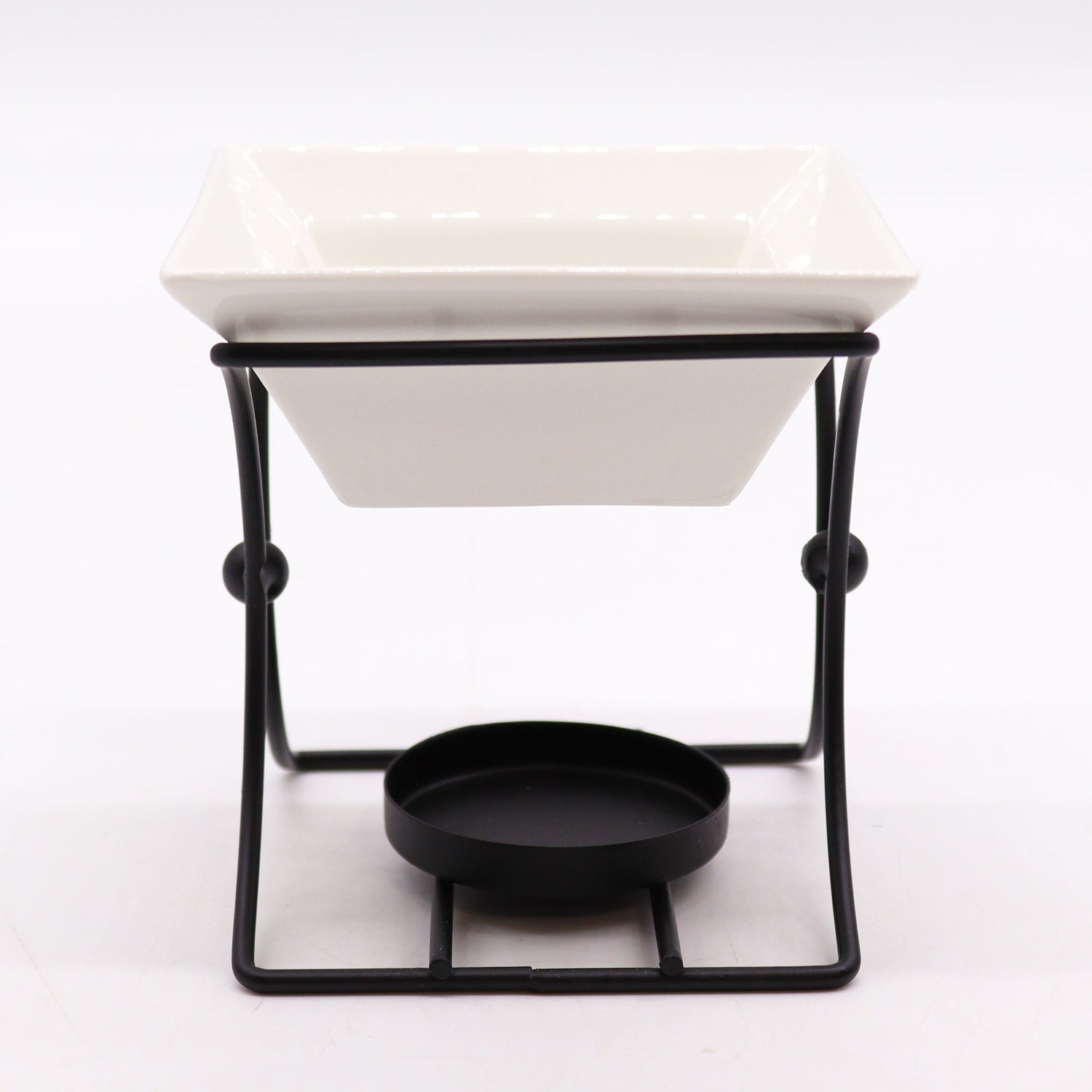 Προσθέστε νερό στο μπολ με μερικές σταγόνες αιθέριου ελαίου. Τοποθετήστε ένα ρεσώ στη ενσωματωμένη θήκη από κάτω και αφήστε τη απαλή θερμότητα να απελευθερώσει ένα απαλό, ομοιόμορφο άρωμα. Το τετράγωνο, γυαλιστερό πιάτο αφαιρείται εύκολα για καθάρισμα· το ανοιχτό, κυρτό μεταλλικό πλαίσιο με τη μικρή κεντρική σφαίρα κρατάει το σχήμα ελαφρύ αλλά σταθερό. Μπορεί επίσης να ζεστάνει κεριά ή να σιγοβράσει κόκκους αν προτιμάτε. Για ασφάλεια, χρησιμοποιήστε σε ανθεκτική στη θερμότητα επιφάνεια, επιλέξτε ποιοτικά ρεσώ και μην αφήνετε ποτέ τη φλόγα χωρίς επίβλεψη.