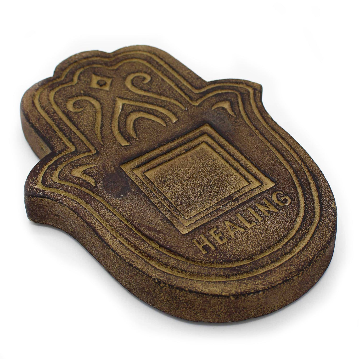Σχηματισμένο ως μια στυλιζαρισμένη ανοιχτή παλάμη (Hamsa), το κομμάτι έχει έναν ζεστό παλαιωμένο μπρούντζινο-χρυσό τόνο με πιο σκούρες αποχρώσεις που εναποτίθενται στην υφή και την πατιναρισμένη επιφάνειά του. Ανυψωμένες και εσοχές λεπτομέρειες — ένα κεντρικό τετράγωνο πάνελ, καμπυλωτές σπείρες, ένα μικρό διαμάντι κοντά στην κορυφή και συγκεντρικοί περίβολοι που ακολουθούν το χέρι — δίνουν βάθος στο σχέδιο, ενώ οι στρογγυλεμένες άκρες και η συμπαγής, χυτή αίσθηση προσκαλούν την αφή. Κατά μήκος της κάτω άκρης, η λέξη "HEALING" είναι απαλά χαραγμένη ως μια ήσυχη υπενθύμιση. Η Hamsa θεωρείται ευρέως στις παραδόσεις της Μέσης Ανατολής και της Βόρειας Αφρικής ως σύμβολο προστασίας και ευλογίας· πολλοί την κρατούν στο σπίτι ως καθημερινό σημάδι φροντίδας και καλής θέλησης. 🫶