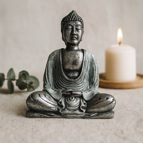Καθισμένη σταυροπόδι με τα χέρια να ακουμπούν στην αγκαλιά, η φιγούρα κρατά το Dhyana mudra — μια κλασική χειρονομία διαλογισμού στην βουδιστική τέχνη. Ο ρόμπος πέφτει σε στρωτές πτυχές, το πρόσωπο είναι ήρεμο με κλειστά μάτια, και οι υφασμένες μπούκλες με επιμηκυμένους λοβούς αυτιών αντανακλούν μακροχρόνιες γλυπτικές λεπτομέρειες. 🧘
