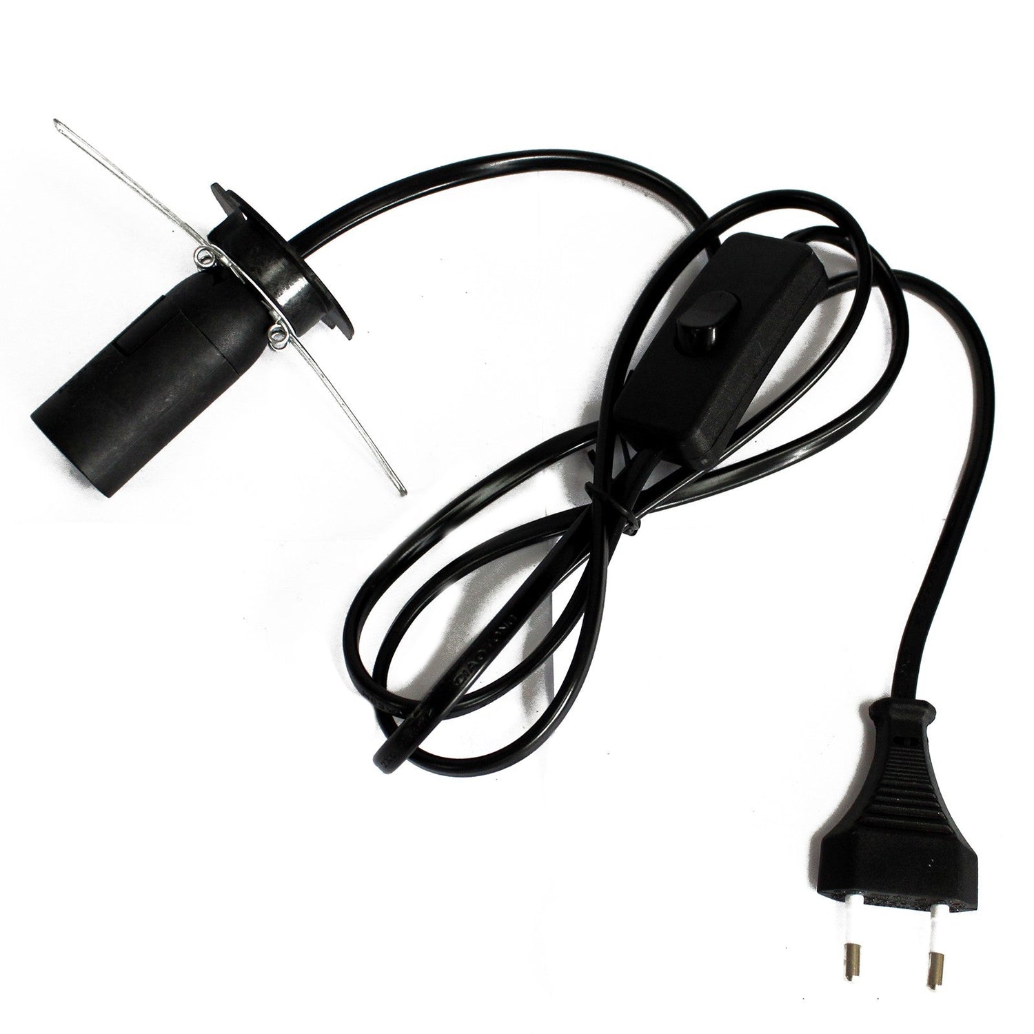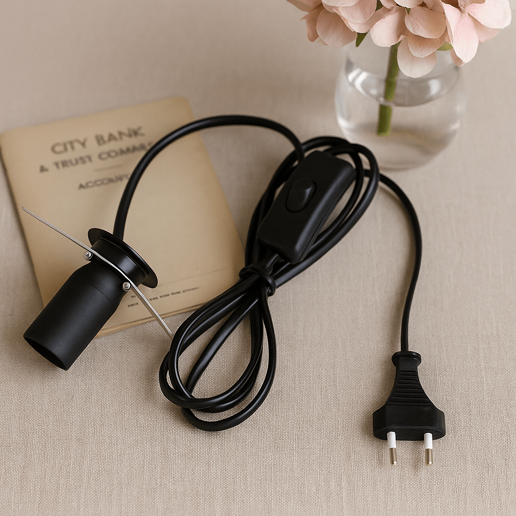 Η σύνδεση περιλαμβάνει έναν κυλινδρικό μαύρο στήριγμα λάμπας με στρογγυλή φλάντζα στερέωσης που ασφαλίζεται με δύο ορατές βίδες, καθώς και δύο αντίθετους ελατηριωτούς βραχίονες που κάθονται σταθερά μέσα στην κοιλότητα του φωτιστικού. Ένας ενσωματωμένος μαύρος διακόπτης τύπου rocker βρίσκεται κατά μήκος του μονωμένου καλωδίου, και ένα καλούπωμα φις με δύο στρογγυλές μεταλλικές ακίδες ολοκληρώνει το σετ. Λειτουργικό, μινιμαλιστικό και διακριτικό.