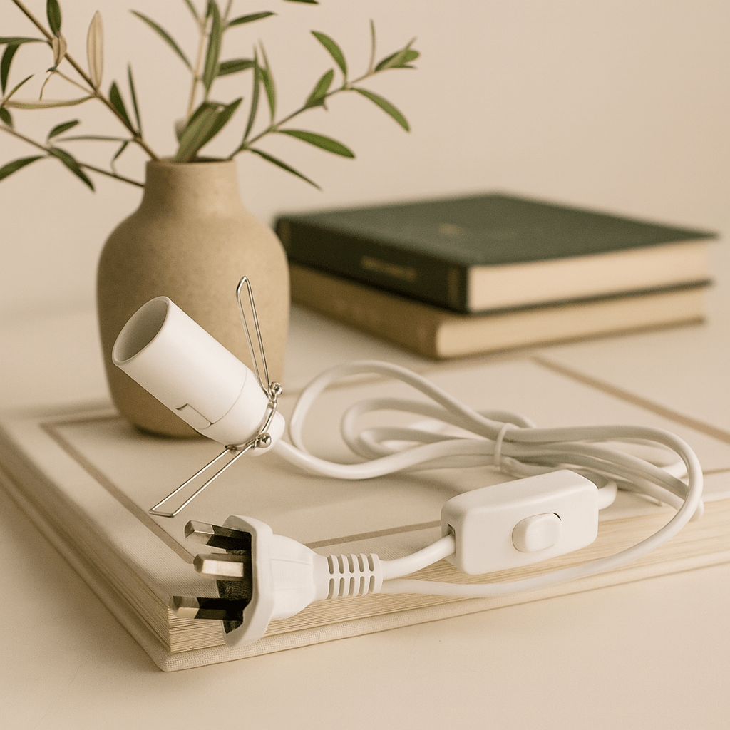 Αυτό το σετ καλωδίου με τροφοδοσία από το δίκτυο διαθέτει φις τύπου G για Ηνωμένο Βασίλειο, εύκαμπτο καλώδιο PVC 1,5 μ., και λευκή κυλινδρική βάση λάμπας με μεταλλικό σφιγκτήρα και δύο εξωτερικά ελατήρια για ασφαλή, συμβατή εφαρμογή. Οι καλυμμένες ενισχύσεις τάσης σε κάθε άκρο υποστηρίζουν την καθημερινή χρήση.