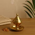 Η μορφή του από γυαλισμένο μέταλλο είναι λεία και σταθερή στο χέρι: ένα κωνικό, καπακωτό πάνω μέρος με ένα κομψό διακοσμητικό κάθεται πάνω σε ένα ρηχό πιάτο σε κεντρικό στέλεχος. Πολλαπλές κυκλικές οπές γύρω από το πάνω τμήμα αφήνουν το άρωμα να απλωθεί αργά, ενώ οι ομόκεντρες ραβδώσεις προσθέτουν έναν διακριτικό, απτικό ρυθμό. Φινιρισμένο σε ομοιόμορφο χρυσό τόνο, είναι συμπαγές—περίπου 6,5 εκ. ύψος με βάση 6 εκ.—οπότε ακουμπά εύκολα σε ράφι, βωμό ή γωνιά σπα. ✨