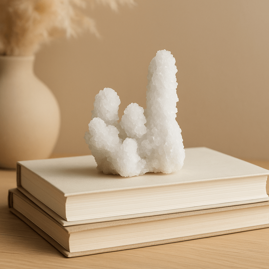 Ο χαλαζίας έχει εκτιμηθεί σε όλη την Ινδική υποήπειρο για αιώνες στην τέχνη και τα στολίδια — αξιόλογος για την καθαρότητα, τη λάμψη και την ανθεκτική ομορφιά του. Τοποθετήστε τον όπου φτάνει το φως: σε γραφείο, ράφι ή ήσυχο βωμό· κοντά σε παράθυρο προσφέρει μια ήρεμη, φωτεινή παρουσία. Ένα στοχαστικό δώρο για λάτρεις του σχεδιασμού και της γεωλογίας. 🌿