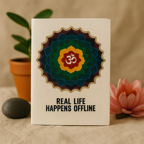 Τα άκρα των δαχτύλων σας συναντούν την απαλή, φυσική υφή του χαρτιού Lokta. Το εκρού εξώφυλλο φέρει μια πολύχρωμη μάνταλα που περιβάλλει το σύμβολο Om, στηριζόμενο από μια ήρεμη υπενθύμιση: «Η ΠΡΑΓΜΑΤΙΚΗ ΖΩΗ ΣΥΜΒΑΙΝΕΙ ΕΚΤΟΣ ΔΙΑΔΙΚΤΥΟΥ.» 🌿