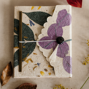 Πιεσμένα πέταλα μπουκαμβίλιας και απαλές πράσινες νιφάδες φύλλων αναπαύονται πάνω σε υφασμένο χαρτί Lokta, με τα ζωηρά τους μοβ να ξεχωρίζουν σε ένα φυσικό, ινώδες φόντο. Κάθε εξώφυλλο φέρει τις δικές του απαλές παραλλαγές. 🌸