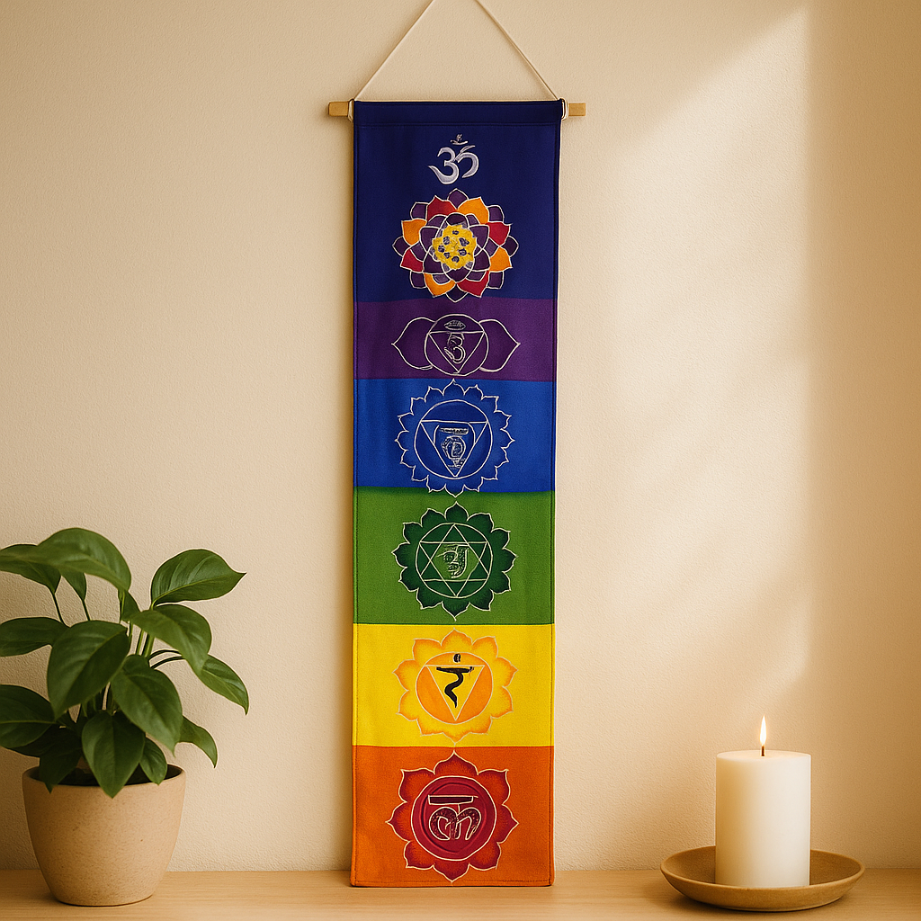 Η παλέτα ρέει από βαθύ βιολετί και ίντιγκο μέσω μπλε, πράσινου, κίτρινου, πορτοκαλί, έως ζεστό κόκκινο. Κάθε λωρίδα φέρει ένα στυλιζαρισμένο λωτό/μαντάλα με έναν κεντρικό χαρακτήρα σανσκριτικά, με ένα μικρό σύμβολο κορώνας στην κορυφή. Σε πολλές νότιοασιατικές παραδόσεις, αυτή η ακολουθία χρωμάτων των τσάκρα είναι μια οπτική υπενθύμιση της επίγνωσης και της ισορροπίας από τη ρίζα έως την κορώνα· ο λωτός συνδέεται με την καθαρότητα και την ανθεκτικότητα, ενώ το μαντάλα εκφράζει την αρμονία και την πληρότητα. Με διαστάσεις περίπου 183 × 35 εκ, ταιριάζει σε στενούς τοίχους, πλαισιώνει πόρτες και δημιουργεί μια ήρεμη ατμόσφαιρα για φόντα εκδηλώσεων ή δημιουργικές εκθέσεις. 🪷