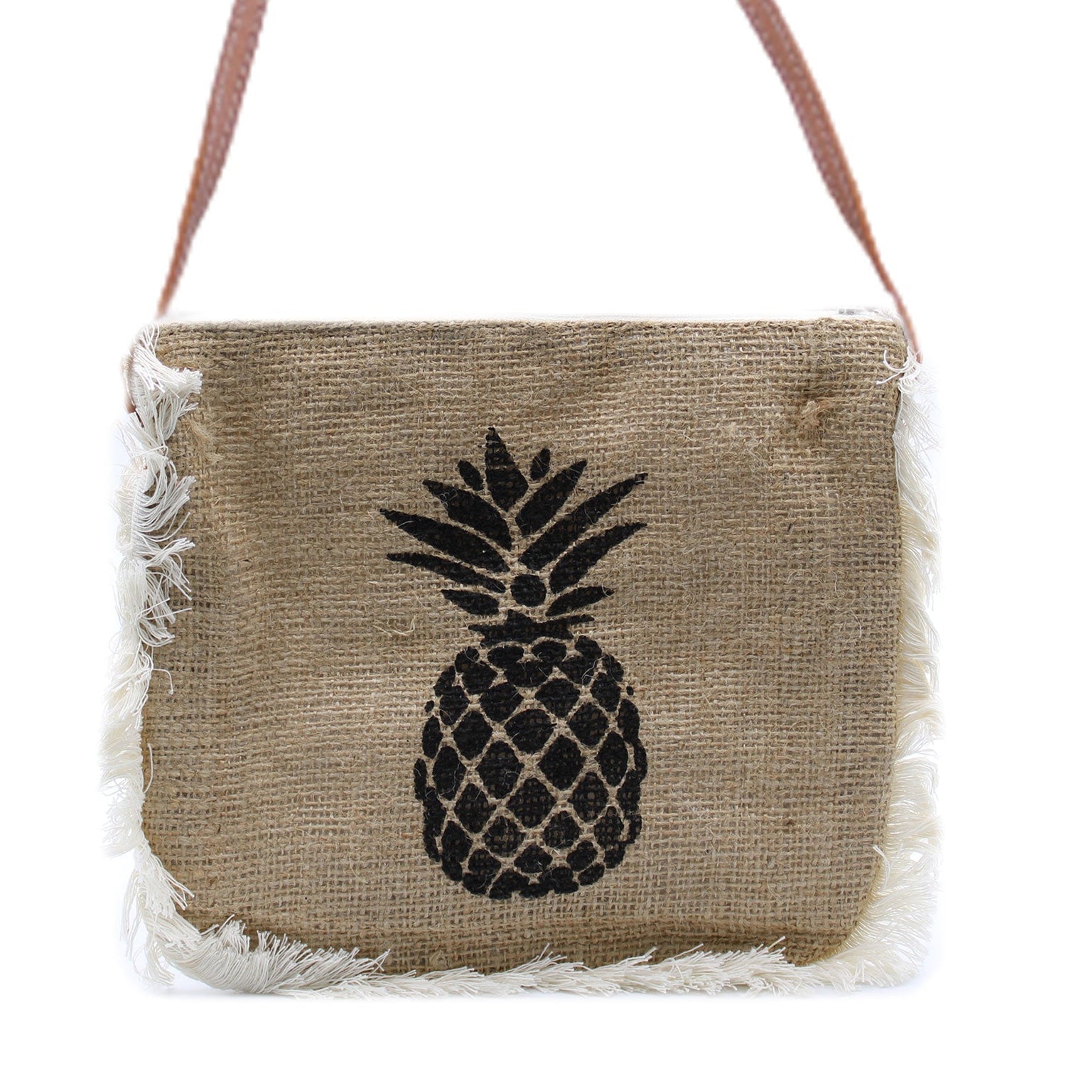 Κατασκευασμένο από ένα χοντρό, ύφασμα που μοιάζει με λινάτσα, αισθάνεται ανθεκτικό αλλά ελαφρύ. Ο καφέ ιμάντας ώμου ακουμπά άνετα στο σώμα, ενώ οι ορατές ραφές και οι απαλά στρογγυλεμένες γωνίες προσδίδουν έναν απλό, ειλικρινή χαρακτήρα. Το λευκό κρόσσι κατά μήκος των πλευρών και της βάσης προσθέτει ένα χαλαρό φινίρισμα, και το φερμουάρ ανοίγει ομαλά για το τηλέφωνο, το πορτοφόλι ή τα κλειδιά. Το μοτίβο του ανανά είναι ευρέως αναγνωρισμένο ως σύμβολο καλωσορίσματος και φιλοξενίας—ένα ήσυχο σύμβολο ζεστασιάς που μπορείτε να κουβαλάτε όλη μέρα. 🪽
