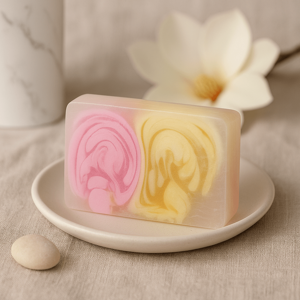 Κάθε σαπούνι είναι μια διαυγής έως γαλακτώδης φέτα με σατινέ γυαλάδα, σχηματισμένη σε καθαρές γραμμές και μαλακές άκρες. Στο εσωτερικό, παστέλ κορδέλες ροζ και κίτρινου κυλούν σαν ευαίσθητοι στροβιλισμοί, έτσι κανένα κομμάτι δεν είναι ακριβώς ίδιο. Κατασκευασμένο με τη μέθοδο melt-and-pour με βάση φυτική γλυκερίνη, αφρίζει εύκολα και ξεπλένεται καθαρά, αφήνοντας το δέρμα άνετο και φρέσκο. Το άρωμα μανόλιας είναι βελούδινο και αέρινο, με μια νότα φωτεινότητας εσπεριδοειδών.