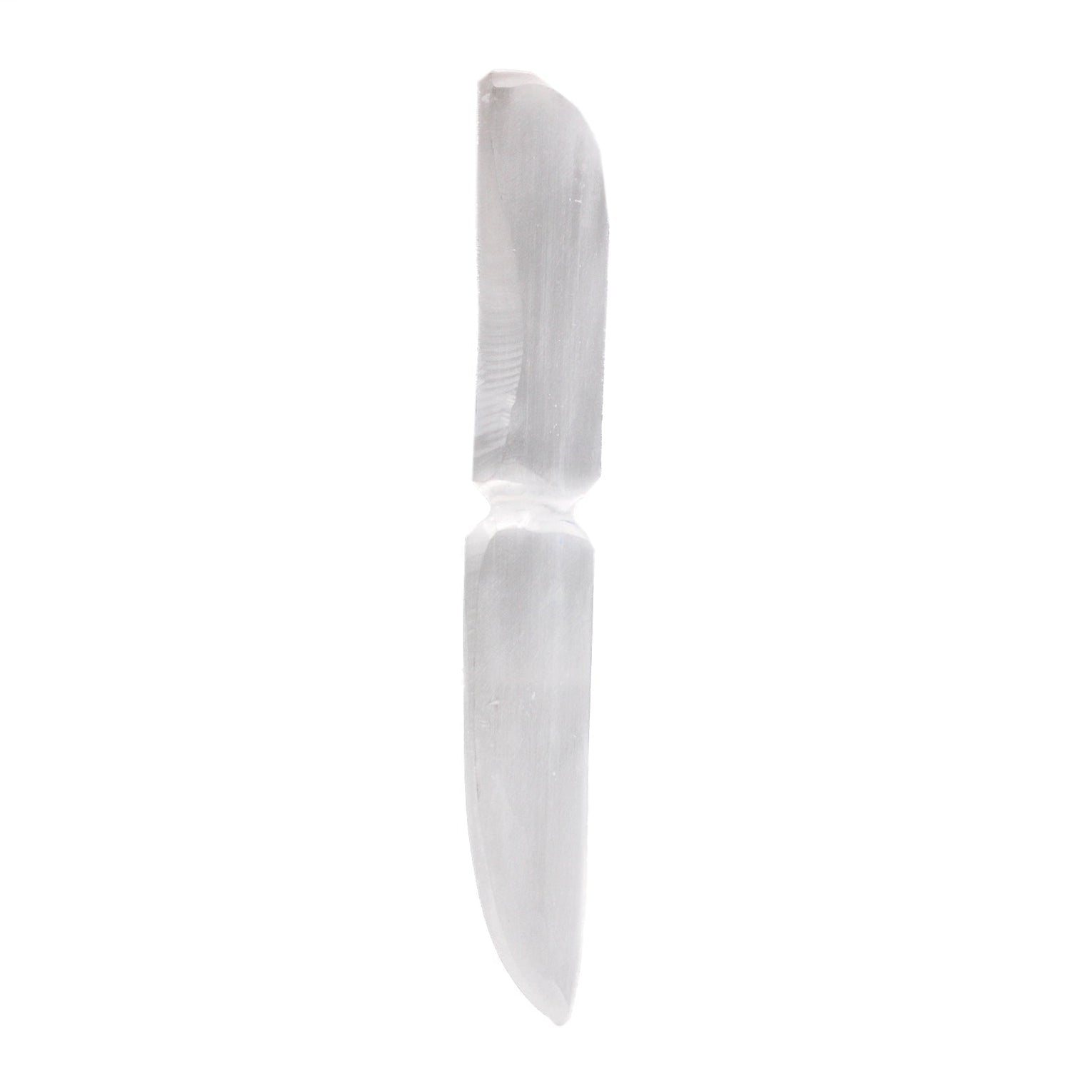 Δροσερή στην αφή και απαλά φωτεινή, αυτή η λεπίδα σεληνίτη αιχμαλωτίζει το φως κατά μήκος των φυσικών, επιμήκων ραβδώσεών της. Χαραγμένη από ένα ενιαίο κομμάτι με στρογγυλεμένη άκρη και λεία, μη οδοντωτή ακμή, νιώθει ήρεμη στο χέρι—ένα αντικείμενο που μοιάζει με μαχαίρι, αλλά φτιαγμένο για τελετουργικό νόημα και όχι για κόψιμο. 🌙