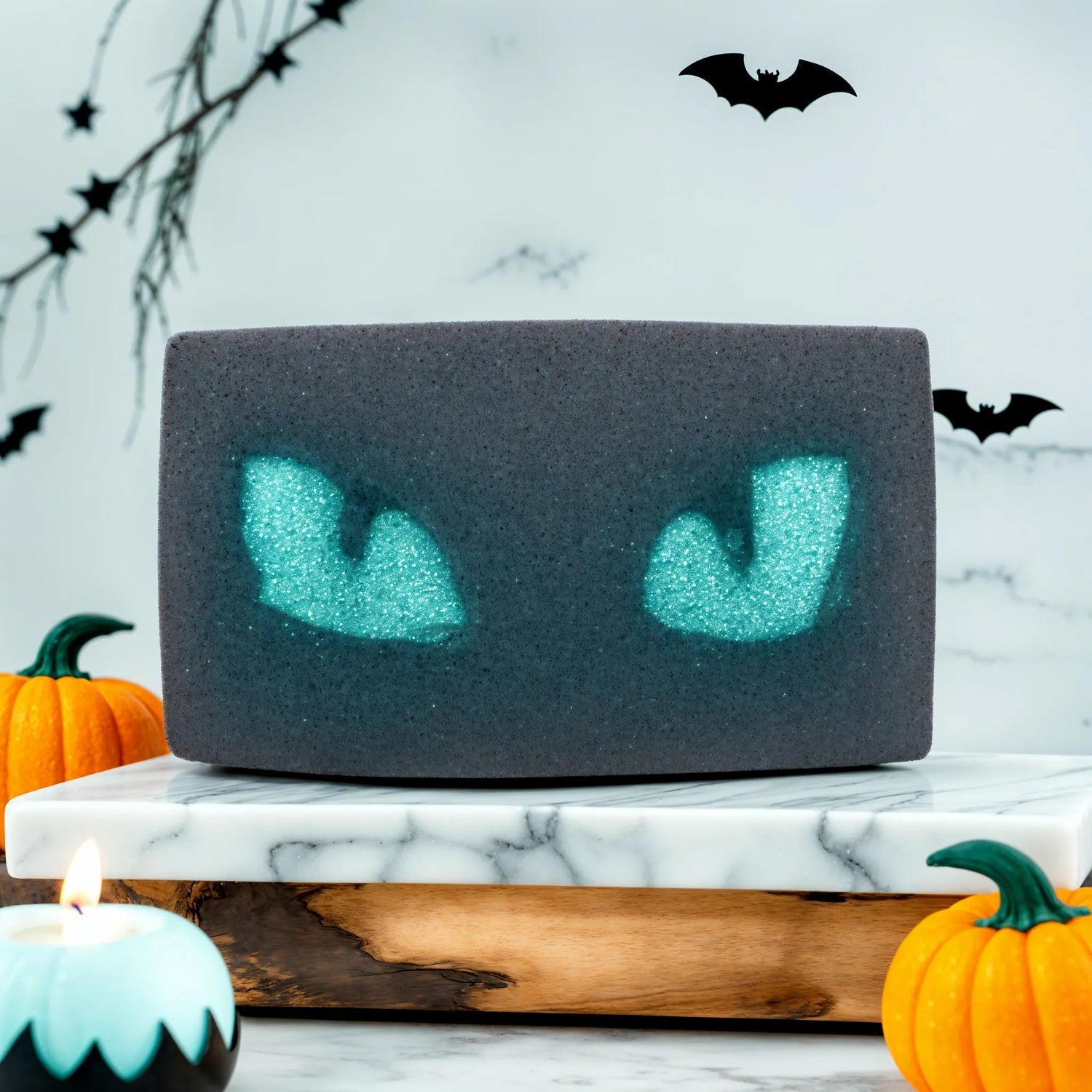 Una bomba de baño negra mate, ligeramente texturizada, descansa en la palma de tu mano: una elegante barra rectangular con un estampado de ojos de gato verde azulado. Elaborada en el Reino Unido y con un peso de 80 g, ofrece un ritual pequeño pero constante: sumérgela en agua tibia y escucha cómo su suave efervescencia te invita a relajarte. 🎃