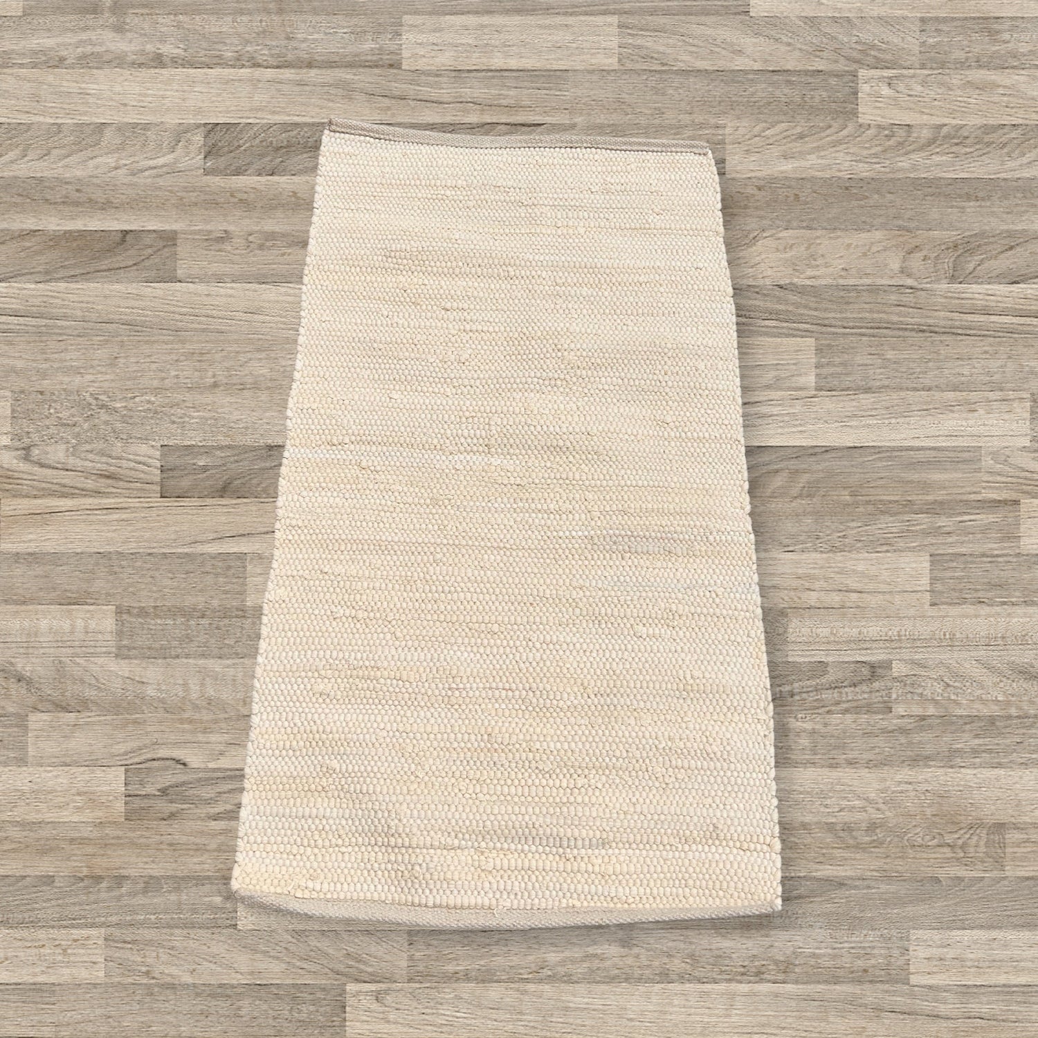 Tejido a mano en India según la tradición dhurrie, la superficie presenta suaves estrías horizontales donde se unen hilos gruesos y finos, creando un fondo blanquecino con una profundidad tonal natural. El tejido es resistente pero flexible, con bordes limpios y acabados que le dan un aspecto minimalista y sereno. 🧵