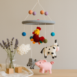 Un anillo circular gris ancla la composición, suspendido de un limpio cordón blanco. De él, hebras de suaves bolas de fieltro —azul, rosa, morado, amarillo y turquesa— salpican el aire con un color sobrio. Alrededor y debajo, aparecen encantadoras figuras de granja en lana: un gallo rojo y amarillo con cresta y cola impecables, un cerdo rosa con rasgos bordados, una oveja blanca con textura rizada, una vaca blanca y negra con cuernos diminutos y un burro gris con crin y cola más oscuras. Cada una tiene pequeños ojos negros y costuras a mano visibles que aportan calidez y carácter.