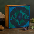 La madera tiene un acabado natural teñido con veta visible; los bordes están ligeramente desgastados para un tacto suave y desgastado por el tiempo. Dos finas ranuras a lo largo de la tapa añaden un detalle limpio y lineal. En el frente, un panel esmaltado incrustado brilla con intensos tonos índigo, azul y verde: perfiles espejados con forma de lobo, lunas crecientes, vides frondosas y un reposaojos central dentro de un borde azul y finos detalles en las esquinas. En muchas tradiciones, la luna marca ciclos y renovación; el lobo sugiere intuición y parentesco; la mirada atenta es una simple señal de conciencia y cuidado. Colócalo en un estante para realzar el espacio o regálalo como un detalle para alguien que aprecie los estampados, la artesanía y los tonos del cielo nocturno. 🐺