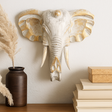 Esta gran escultura de pared frontal presenta un perfil majestuoso: orejas acampanadas y festoneadas; una trompa finamente delineada; colmillos puntiagudos; y una frente redondeada. El acabado envejecido revela matices más oscuros y un sutil craquelado, que le aporta profundidad y una calma desgastada por el tiempo. Los reflejos dorados aportan un brillo sereno sin deslumbrar, otorgando a la pieza una presencia serena y majestuosa. ✨