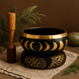 El cuenco de 14 cm presenta un exterior negro brillante con un borde dorado pulido y un motivo repetitivo de las fases lunares, desde la fase creciente hasta la fase llena. El interior presenta un suave acabado metálico cepillado cerca del borde. Con un peso aproximado de 0,9 kg y una altura de 6,5 cm, se siente estable en las manos y produce tonos claros y resonantes con facilidad. Los cuencos cantores han apoyado durante mucho tiempo las prácticas meditativas y rituales en las tradiciones del Himalaya: sonidos simples utilizados para centrar la atención, iniciar y cerrar sesiones y anclar la respiración. El ciclo lunar evoca cambio y renovación; muchos mantienen símbolos lunares cerca como un recordatorio silencioso de los ritmos naturales y la reflexión.