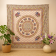 Un tejido suave y ligero crea un fondo en tonos crema claro y rosa pálido para un medallón circular central. Anillos concéntricos fluyen hacia afuera con un ritmo equilibrado: elefantes estilizados que caminan en un círculo suave, con sus mantas decorativas en tonos púrpura y azul con toques de verde, rosa, rojo y amarillo; entre ellos, finos puntos geométricos, diamantes y motivos en forma de pétalos; a su alrededor, un exuberante borde de enredaderas enmarca el conjunto. La lámina tiene un tacto suave y una caída natural, que aporta profundidad y una calma táctil a la pared. Colgada verticalmente, la disposición circular guía la mirada hacia adentro y hacia abajo, aportando una sensación de equilibrio y presencia. 🧵