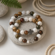 Gemas de jaspe Picasso y howlita blanca, cuentas redondas y lisas de 8 mm con brillo mate-satinado. Marrones terrosos y neutros se combinan con azules profundos y medios; la tira blanca luce finas vetas grises. Una pequeña cuenta cúbica plateada con un corazón le da un sutil toque. Ensartada en un elástico resistente para un ajuste cómodo en la mayoría de las muñecas; bucle continuo sin cierre. Hecho a mano en China. 🌊