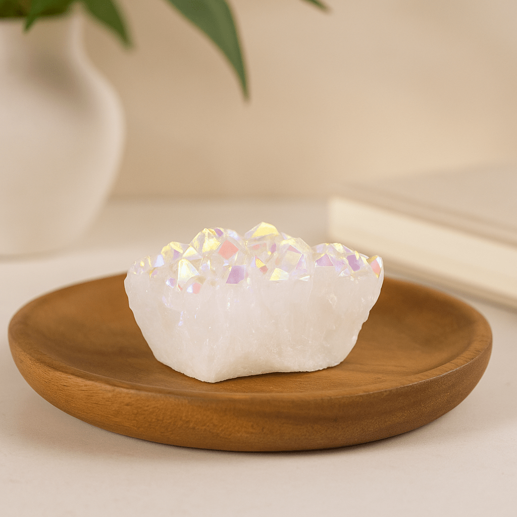 El racimo es irregular y orgánico. Una base robusta y cuadrada sostiene una corona dentada de puntas multifacéticas. La superficie superior es finamente drusa, brillando al girarla; los lados son más rugosos y mates a la vista y al tacto. Su cuerpo permanece translúcido a blanco opaco, mientras que un brillo iridiscente AB destella en rosa, amarillo, verde y violeta. Reflejos prismáticos se mueven por los planos, dándole presencia sin ser llamativa.