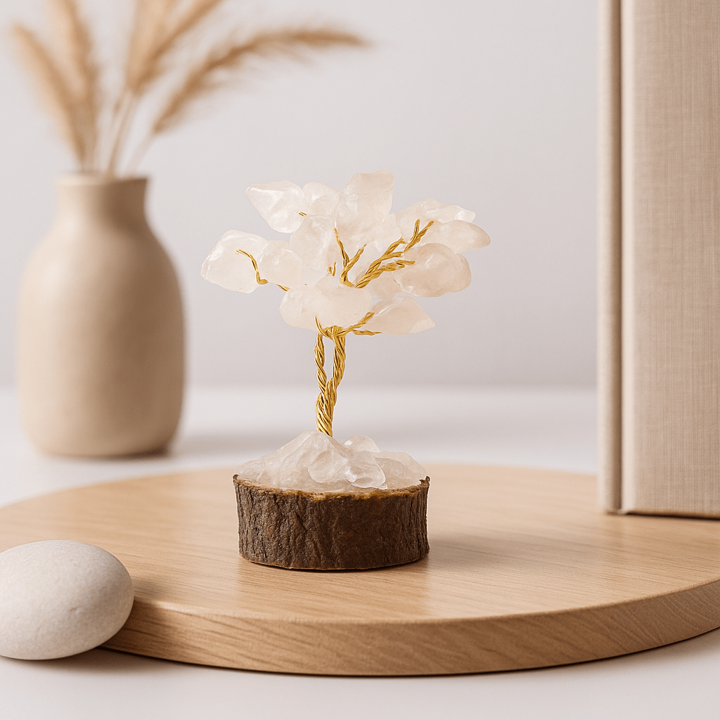 Sobre una lámina lisa de madera, con el borde de la corteza intacto, se alza una pequeña figura similar a un bonsái en un alambre dorado. Las virutas translúcidas de cuarzo roca captan la luz con un brillo suave y limpio, aportando una presencia serena y artística a un estante, escritorio o mesita de noche.