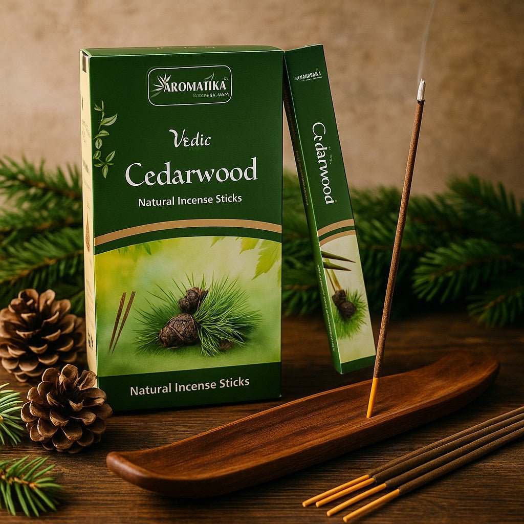 Al prender la punta, se despliega una suave columna de humo. El cedro seco inunda la habitación —cálido, amaderado, con un suave susurro resinoso— invitando a una atención serena. 🌲🕯️