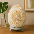 Un mosaico ovalado de conchas naturales, de color blanco a marfil con delicadas puntas en espiral, envuelve una luz cálida y relajante. Su textura es de una belleza táctil, con una roseta en forma de flor en el centro que capta y dispersa la luz en suaves ondas. Descansando sobre una pequeña base azul claro con un suave acabado envejecido, trae la tranquilidad del aire costero a tu espacio sin una sola palabra.