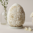 Conchas marinas auténticas, engastadas en delicados racimos de rosetas, forman un tono ovoide, suavemente mate, que brilla con la calma costera. Los tonos blanquecinos y las texturas finas y estriadas captan la luz con suavidad, descansando sobre una sencilla base circular blanca. 🐚