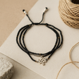 Suaves cordones negros se unen en la muñeca, rematados con pequeñas cuentas brillantes. Un elegante nudo calado en tono plateado descansa en el centro, suave y firme contra la piel. 🖤