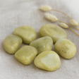 Frescas al tacto y delicadamente brillantes, estas piedras de prasiolita pulidas revelan verdes suaves que cambian del pálido tono de la hoja al verde amarillento con la luz. Sus superficies brillantes y redondeadas y su sutil veteado invitan a una mirada pausada. Portadoras naturales de la sabiduría serena de la tierra, están pulidas para que su belleza interior y su sutil energía se encuentren con la palma de la mano: compañeras inseparables para la meditación, la reflexión y la vida consciente. 🌿