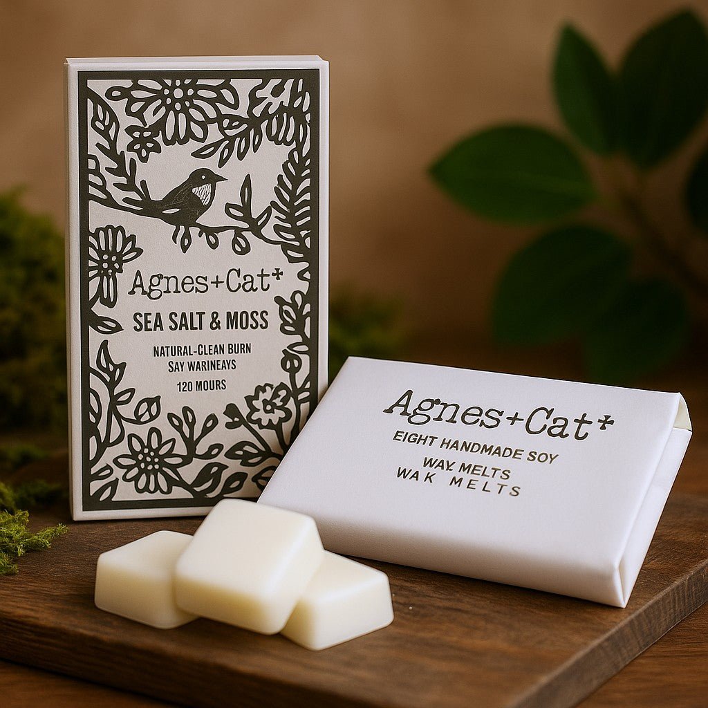 Un juego de ocho melts hechos a mano, presentados de forma sencilla en un diseño monocromático nítido con detalles botánicos: fáciles de tener a mano y un obsequio considerado para compartir. 🕊️