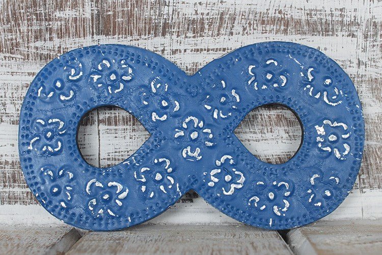 Fabricada en madera, se siente firme en la mano: robusta, suave y reconfortante. Una superficie azul pintada a mano con suaves acentos blancos se asienta en un acabado mate, dejando que la luz incida suavemente sobre los detalles florales en relieve y los bordes punteados. Los centros abiertos de la figura en forma de ocho aportan amplitud y espacio, mientras que el cuerpo de madera ofrece una resistencia duradera y una calidez orgánica que solo la madera puede retener. 🌿