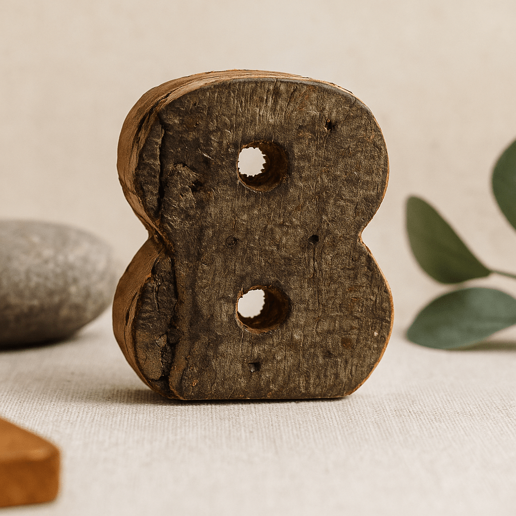 Bordes de corteza cruda, una delicada esfera gris-marrón y la suave curva de dos bucles equilibrados: este 8 de madera aporta encanto natural y presencia simbólica a tu espacio. Más que un número, puede marcar una intención o un hito, invitando a la calidez y la concentración dondequiera que se coloque. ♾️