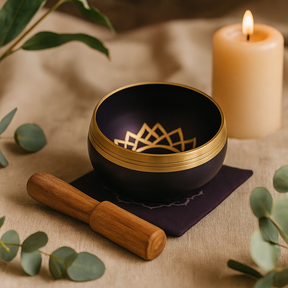 El pequeño cuenco de metal tiene un exterior oscuro mate con un borde dorado pulido, acentuado por una fina banda geométrica de mandala. Un mazo de madera lisa se apoya con naturalidad en la mano, mientras que el cojín cuadrado morado estabiliza el cuenco y libera su resonancia. En las tradiciones del yoga, el Sahasrara (el chakra de la coronilla en la parte superior de la cabeza) se asocia con la conciencia y la claridad espaciosa; la paleta violeta lo honra. El motivo del mandala evoca plenitud y equilibrio, un recordatorio sereno para centrarse. 🧘