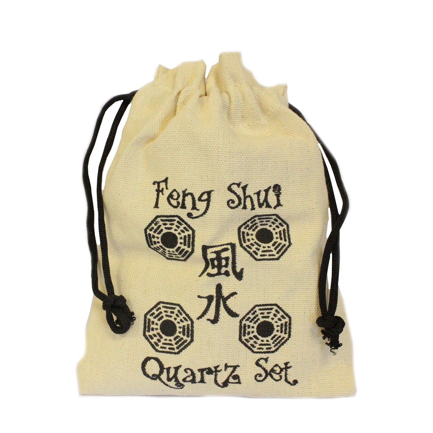 Tus piezas llegan en una bolsa beige claro con cordón, una textura natural similar al lienzo y un estampado negro en contraste: "Feng Shui", "Juego de Cuarzo", los caracteres 風水 y tres emblemas octogonales. Los cordones negros dobles se cierran con un tirón limpio, manteniendo el conjunto unido entre usos. 🕯️