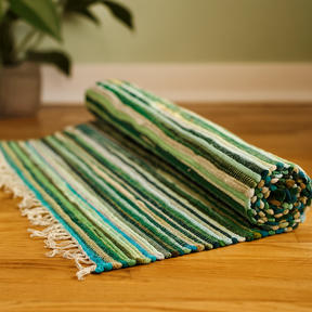 Colócalo junto a la cama, como base para un sillón de lectura o para dar calidez a una entrada: las rayas rústicas y los verdes naturales crean un ambiente tranquilo y acogedor. Un detalle pensado para el día a día que combina valores ecológicos con un estilo atemporal y sencillo. 🏡