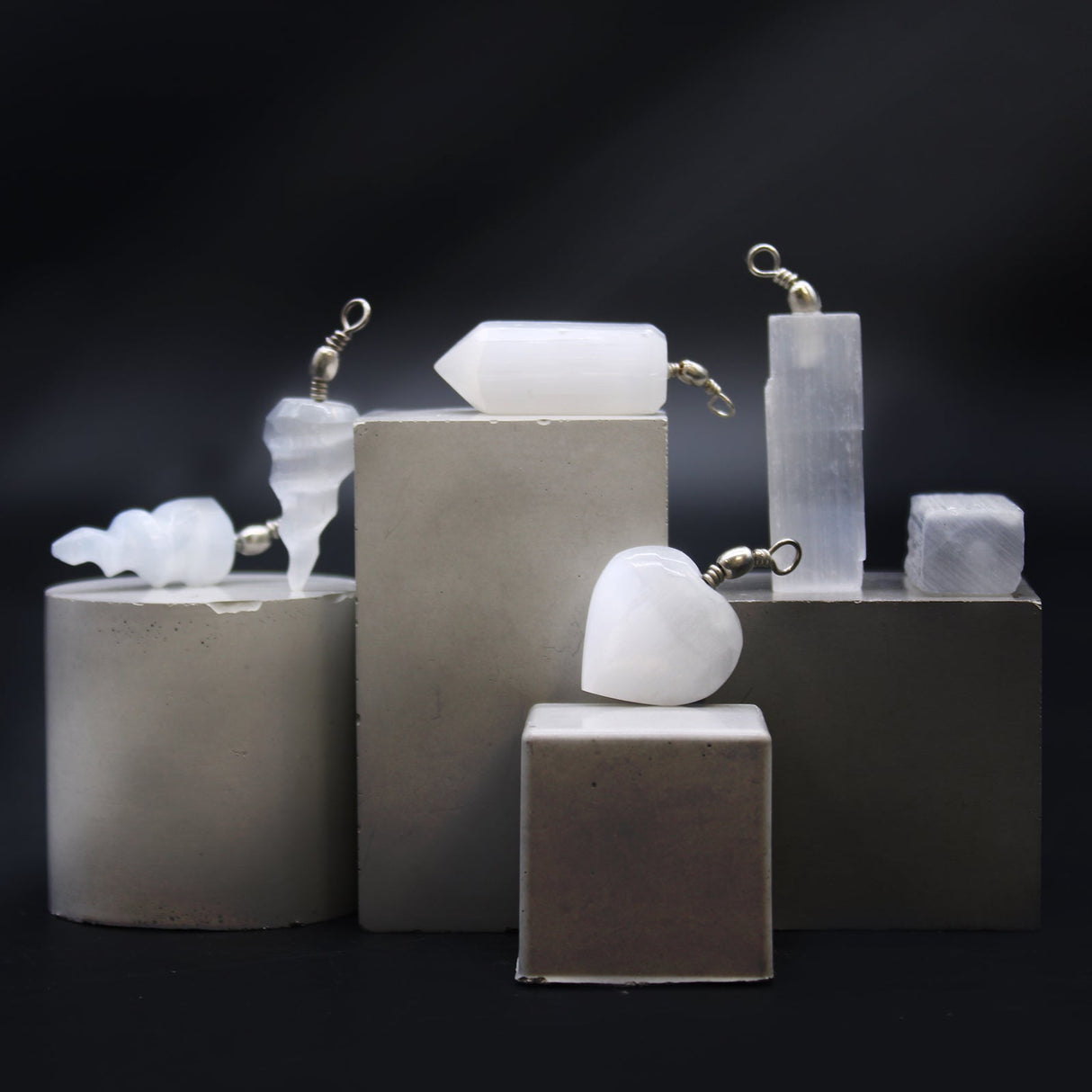 - 🌙 Selenite Glow: Piedra de color lechoso a translúcido con brillo satinado y estrías naturales.
