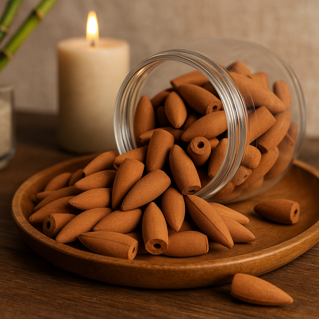 Tuoksu on lämmin ja maanläheinen — kermaisen santalipuun pehmeä, pihkainen makeus ja ripaus mausteisuutta. Jokaisessa matassa, maanruskeassa kartiossa on pieni ontto pohjan läpi; asetettuna backflow-polttimeen savu kerääntyy ja valuu nauhoina, hidas vesiputous, joka rauhoittaa aisteja ilman sanoja. ☁️