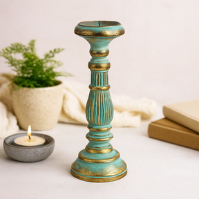 Vakaa ja sulava, tämä käsin veistetty puinen jalusta nostaa pilarikynttilän ja antaa liekin hengittää. Turkoosi, jossa on antiikkikultainen pesu, se toivottaa hehkun tervetulleeksi ja pehmentää huonetta—sopii rauhallisiin iltoihin, pohdiskeleviin hetkiin ja yhteisiin kokoontumisiin. 🕯️