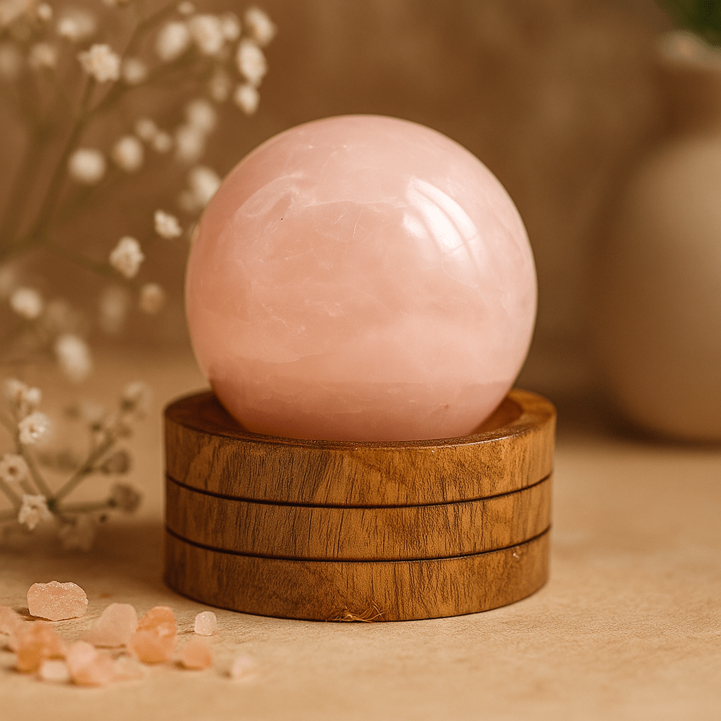 Viileä ja sileä kädessä, tämä 50 mm ruusukvartsipallo näyttää vaaleanpunaisen, puoliläpäisevän hehkun pehmeällä, pilvisellä marmoroidulla kuvioinnilla. Kiiltävä pinta vangitsee valon lempeisiin heijastuksiin, tarjoten rauhallisen läsnäolon huoneessa. Se lepää sylinterimäisellä puukannattimella, jossa on keskiruskea syykuvio ja hienovaraiset urarenkaat, maadoitettu vastapaino kiven kiillolle. Leikattu ja kiillotettu Intiassa. Monissa perinteissä ruusukvartsia arvostetaan sen lempeän sävyn ja rakkauteen liittyvien yhteyksien vuoksi. 🌸🪵