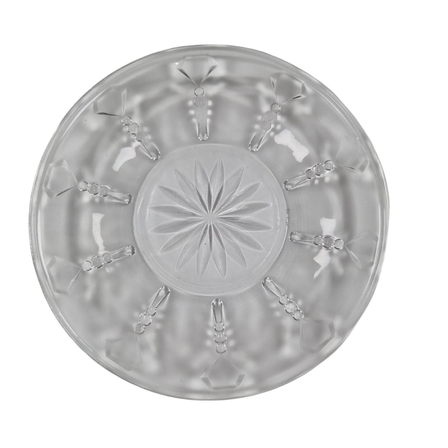 Valmistettu läpinäkyvästä, värittömästä painetusta lasista, matala pyöreä astia (12 × 12 × 2,5 cm) on sileäreunainen ja kiiltäväpintainen. Sen muotoiltu kohokuvio—keskellä säteittäinen tähti timantti- ja helmimäisillä yksityiskohdilla—lisää hienostuneen tekstuurin, jonka voi tuntea, pysyen samalla hillittynä ja tyylikkäänä.