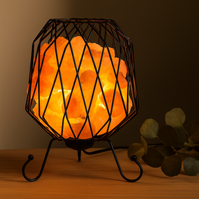 Karkeat vaaleanpunaiset suolakappaleet lepäävät mustassa metallilangasta tehdyssä avonaisessa, monikulmaisessa hiiligrillissä. Ristikkäiset vinot langat luovat timantinmuotoisia aukkoja, jotka päästävät valon hengittämään ja levittävät pehmeitä kuvioita lähellä oleville pinnoille. Pieni keskialusta pitää valonlähteen, kun taas kolmijalkainen jalusta, jonka jalat kaartuvat ulospäin silmukoiksi, pitää muodon vakaana ja ilmavana. Tasainen musta pinnoite kehystää lämmön ilman häikäisyä.